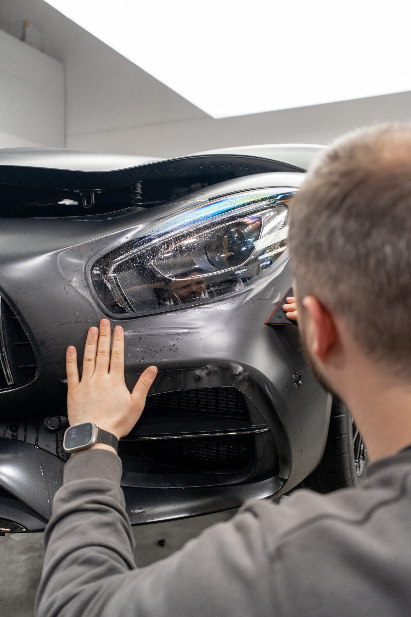 Bevor wir einen Mercedes folieren, steht eine gründliche Fahrzeugaufbereitung im Mittelpunkt. Wir waschen den Wagen schonend per Hand, entfernen Verunreinigungen, führen eine Politur durch und gleichen Unebenheiten aus. So beseitigen wir Kratzer und bereiten eine glatte Oberfläche vor, damit die Folie perfekt anliegt. Optional ergänzen wir eine Keramikversiegelung , die den Wagen an Stellen schützt, an denen eine Steinschlagschutzfolie nicht hält. Diese methodische Vorbereitung garantiert nicht nur ästhetische Perfektion, sondern auch langlebige Haltbarkeit und eine saubere Basis für die Lackschutzfolierung und das Car Wrapping. Ob klassisches Design wie bei einem Mercedes in Anthrazit oder ein individueller Look – die Vorbereitung ist entscheidend für ein makelloses Ergebnis.